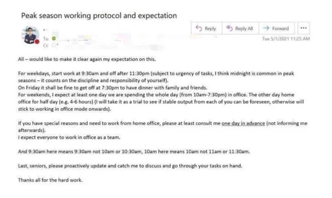 You let people stop work at 7:30pm on a Friday so they can have dinner with friends or family before going back to work till midnight + one day of the weekend (in the office) & another half day from home. Every weekend.